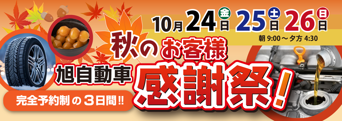 営業日カレンダー更新。10月24・25・26日は秋のお客様感謝祭です。「オイル交換」「夏冬タイヤの入れ替え」は、予約制とさせていただきます。ご予約は、023-631-9366へ。よろしくお願いいたします。新着
